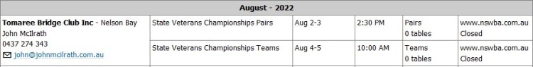 | Tomaree | Swiss Pairs Saturday October 30, 2021 9:30 AM Teams Sunday October 31, 2021 9:30 AM | Details | ![]() |